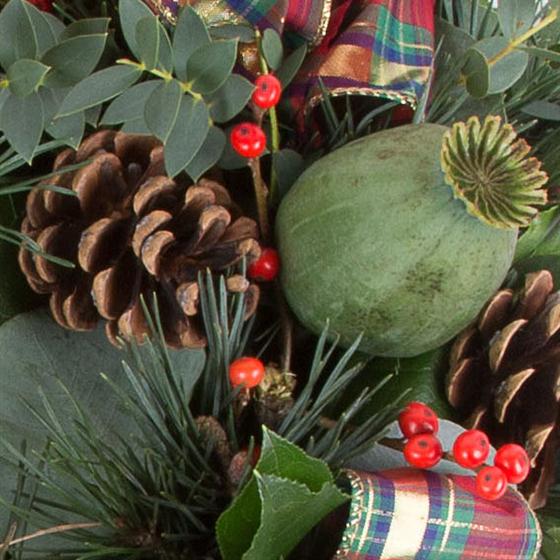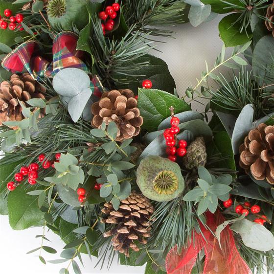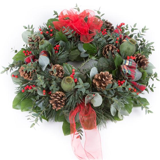 A fresh spruce and winter greens door wreath including ribbon and cones. A perfect, long lasting gift. Please note that two days notice are required when ordering. Decoration colours may vary depending on stock.